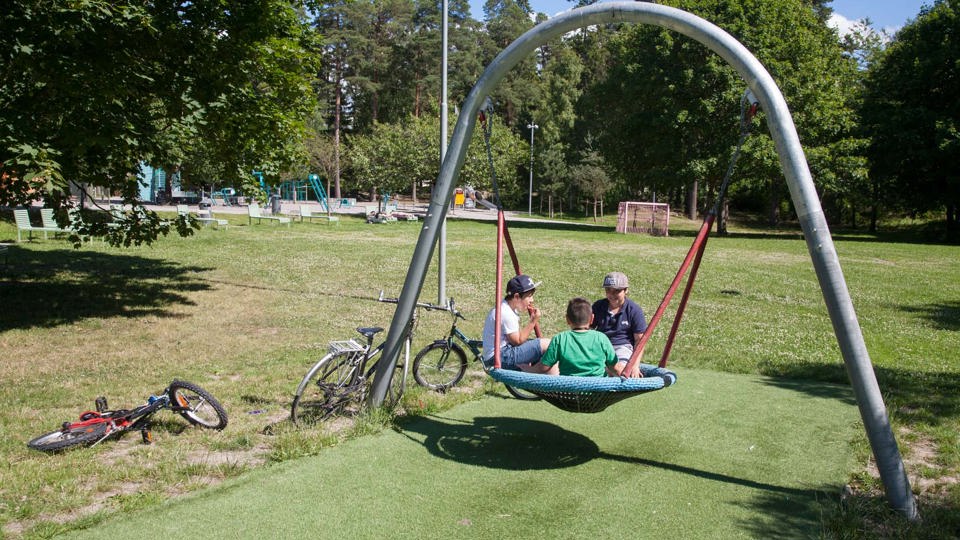 Här finns solstolar, utegym och fotbollsmål på gräs för lekfull fotboll. Parken passar både för aktivitet och vila. Passar för barn från tre år och uppåt.