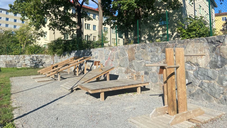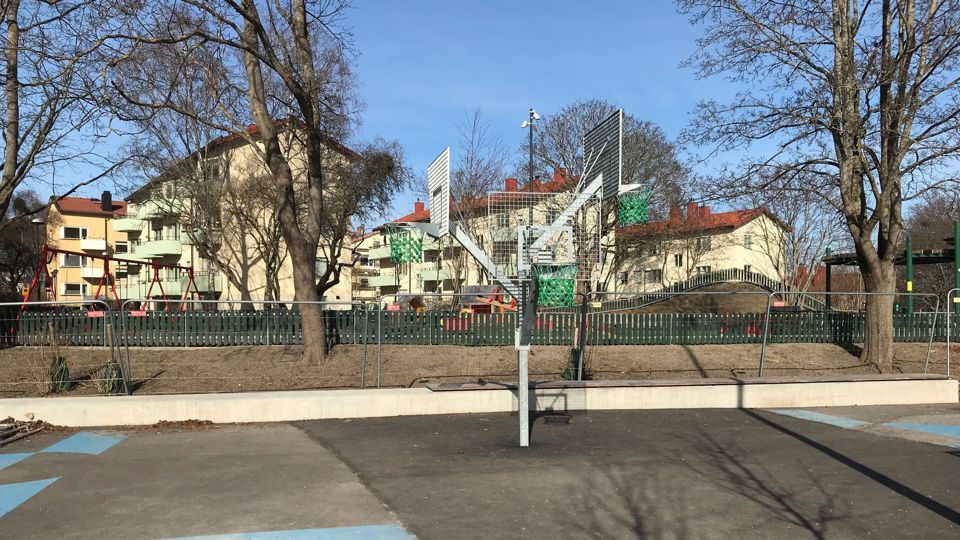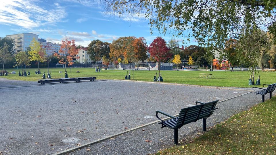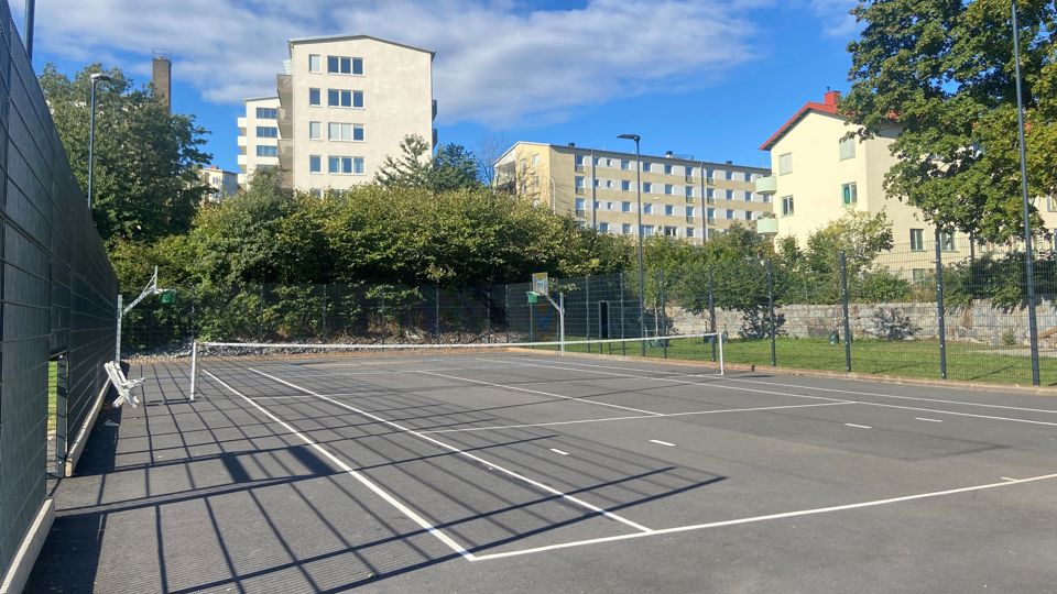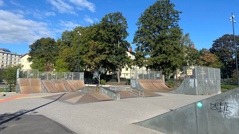 I Tranebergs fritidspark finns bland annat tennisbana, basketkorgar, skateramper, utegym och en boulebana i anslutning till lekplatsen.