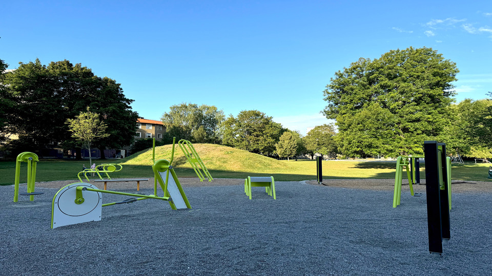 Ett utegym Grötfatsparkens östra del. Utegymmet har redskap i metall, för flera olika övningar.